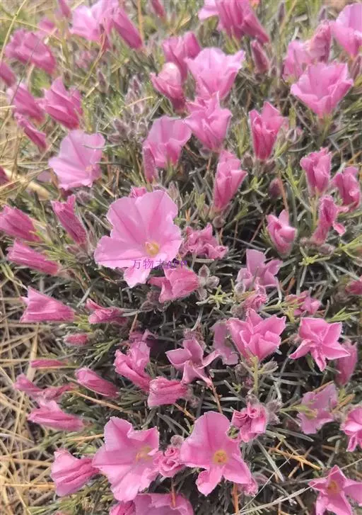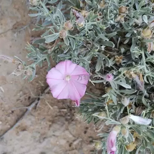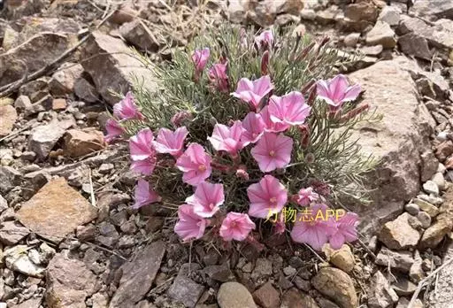 匍匐有刺亚灌木,全体被银灰色绢毛,高4-10-(15)厘米,茎密集分枝,形成披散垫状;小枝坚硬,具刺;叶狭线形,或稀倒披针形,长0.5-2厘米,宽0.5-4(5-6)毫米,先端圆形,基部渐狭,无柄,均密被银灰色绢毛。花2-5(-6)朵密集于枝端,稀单花,花枝有时伸长,无刺,花柄长2-5毫米,密被半贴生绢毛;萼片长5-7(8)毫米,椭圆形或长圆状倒卵形,先端短渐尖,或骤细成尖端,外面被棕黄色毛;花冠漏斗形,长15-25毫米,粉红色,具5条密生毛的瓣中带,5浅裂;雄蕊5,不等长,花丝丝状,无毛,基部扩大,较花冠短一半;雌蕊较雄蕊长;子房有毛,2室,每室2胚珠;花柱丝状,柱头2,线形。蒴果球形,有毛,长4-6毫米。种子卵圆形,无毛。花期5-7月。 刺旋花
