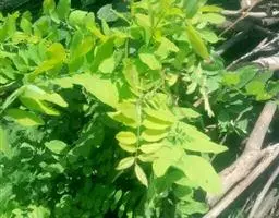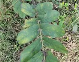 叶长5-20厘米,托叶三角状披针形,长约5毫米,宽约2毫米,两面密被白色短柔毛;叶柄密被褐色腺点和短柔毛;小叶5-17枚,卵形、长卵形或近圆形,长1.5-5厘米,宽0.8-3厘米,上面暗绿色,下面绿色,两面均密被黄褐色腺点及短柔毛,顶端钝,具短 尖,基部圆,边缘全缘或微呈波状,多少反卷。