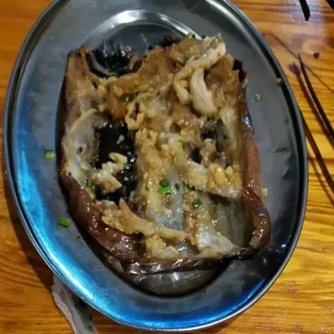 这是一道以茄子、剁椒、大蒜、孜然粉为主要食材进行烤制而成的一道菜品。