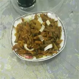 (2)把茄子肉切成段,装盆,撇上木鱼花,配以生姜泥和黄瓜。