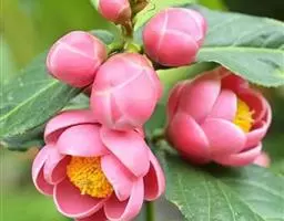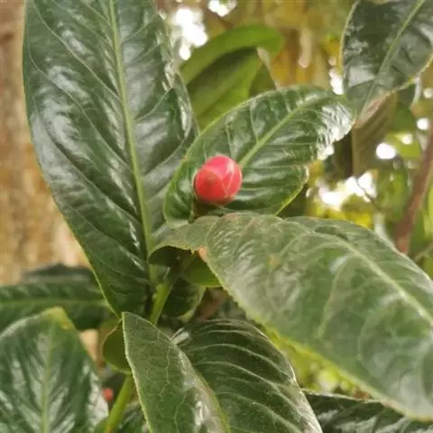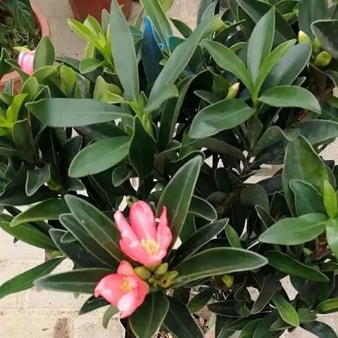 常绿灌木,高1~2.5m,目前最高可达5m,冠幅0.5~1m,最大胸径约5.8cm。阴生或半阴生, “植物界大熊猫”在京亮相 1年可以抽梢3~4次,株型紧凑,分枝密,嫩枝无毛,略显红色,老枝光滑,灰褐色。叶倒卵形、长倒卵形及倒心状披针形,先端园钝或者稍微有凹陷,基部楔形;叶上表面光亮碧绿,下表面浅绿色,两面均无毛,稍被灰粉;侧脉5~8对,干时两面稍可见,中脉两面突起;叶全缘,有时见叶尖端有2~5对锯齿,边缘具透明骨质状狭边,呈互生或轮生,多聚集于枝梢上部;叶柄长0.6~1.2cm,无毛。抽芽时可见先出叶多枚(7~8枚),第一片真叶至顶叶叶间距逐渐变短,枝顶往下基本一腋一花,每梢生1~8个花芽,花艳红色或粉色,无花梗;花在枝上自下而上渐次开放,整个植株形成连续开花的现象。花瓣5~9枚,柱头2~5裂,雄蕊外轮连成桶装。鳞片7~11枚,子房卵形无毛,果为蒴果,呈卵球形、纺锤形或圆锥形,2~4室,每室2粒种子,成熟时果皮由青色变成褐黑色或棕色,果实裂开。