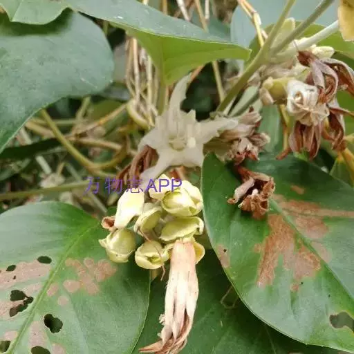 原形态:缠绕藤本。叶卵形至椭圆形,长5~11厘米,宽3~9厘米,先端短尖或钝,基部浑圆或有时微心形,上面秃净或近秃净,下面密被银色紧贴的柔毛。花序腋生或顶生,头状或伞状;花序柄长3.5~7厘米,密被银色柔毛;花柄短,长约5毫米或不及;苞片大,萼片5,矩圆状卵形或卵形,外面的长9~10毫米,内面的较小,外密被银色柔毛;花冠漏斗状,白色,长2.7~2.8厘米,外被银色偃毛,裂片矩圆形,长1.5厘米内外;雄蕊5;子房4室,花柱线形。果近球形,径约8厘米,胭脂色,为卵形凹陷的宿萼所包围。花期秋季。