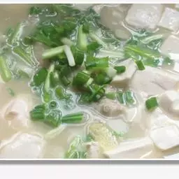 6、煮到白果熟了,倒入豆腐,轻轻地翻动。再放入调味料。