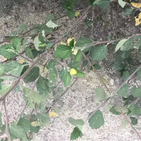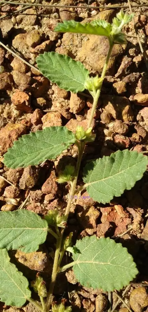 梧桐科匍匐半灌木,高35~150cm,小枝密被短柔毛。叶互生,卵形或长椭圆状卵形,长2~4.5cm,宽1.5~3cm,先端钝,基部圆形或浅心形,边缘有不规则小齿,两面密被星状短柔毛;叶柄长0.5~1cm。聚伞花序腋生,头状,总花梗长0.3~1.6cm;小苞片狭披针形,长约4mm;花萼筒状,5裂,裂片三角形,远较萼筒长,外面被柔毛;花瓣5,淡黄色,矩圆状匙形,比萼略长;雄蕊5,花丝合生成筒状,包围着雌蕊,与花瓣对生;子房无柄,被短柔毛,花柱偏生,柱头流苏状。