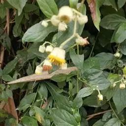 攀援状草质藤本或基部木质,长1-3m或更长。茎圆柱形,多分枝,有明显沟纹,具疏毛或后脱落,节间长6-12cm,小枝节间长2-4cm。下部和中部叶有2-5mm的柄;叶片卵形、卵状长圆形或长圆形,长7-10cm,宽2.5-4cm,先端短尖,基部圆形,边缘有疏细齿或点状齿,上面被疏毛或后脱落,有光泽,干后常变淡黑色,下面无毛或多少被疏毛;中脉在上面明显,在下面突起,侧脉5-7对。小枝上部的叶较小,椭圆形或卵状长圆形,长2-5cm,宽1-1.5cm,具短柄,边缘有细齿。头状花序疏散,通常1-7个在腋生小枝顶端排成总状或近伞房状花序,再排成大型具叶的圆锥花序,花序柄长1-3cm;总苞半球形;总苞片5-6层,外层基部常弯曲,背面被密毛,中层先端稍尖,背面脊处被毛,有缘毛,内层长于最外层的3倍;花托平,密被白色长柔毛;花黄色,雌花多数,细管状,檐部2-4齿裂;两性花花冠管状,被白色多细胞节毛,檐部5齿裂。瘦果圆柱形,有10条棱,被疏毛;冠毛白色,糙毛状。花期8-12月。