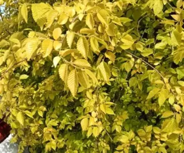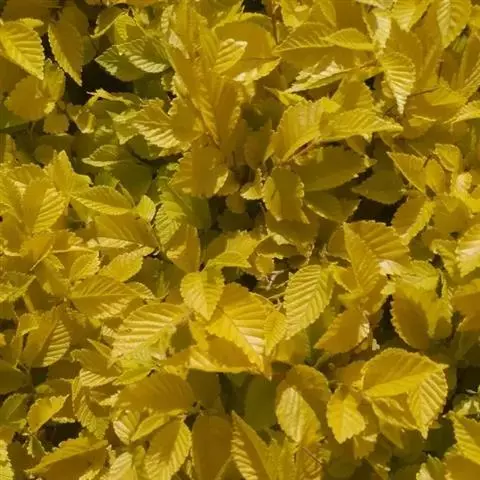中华金叶榆,榆科榆属,系白榆变种。叶片金黄色,有自然光泽,色泽艳丽;叶脉清晰,质感好;叶卵圆形,平均长3-5cm,宽2-3cm, 比普通白榆叶片稍短;叶缘具锯齿,叶尖渐尖,互生于枝条上。金叶榆的枝条萌生力很强,一般当枝条上长出大约十几个叶片时,腋芽便萌发长出新枝,因此金叶榆的枝条比普通白榆更密集,树冠更丰满,造型更丰富。