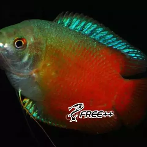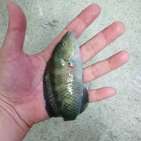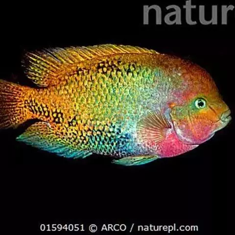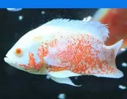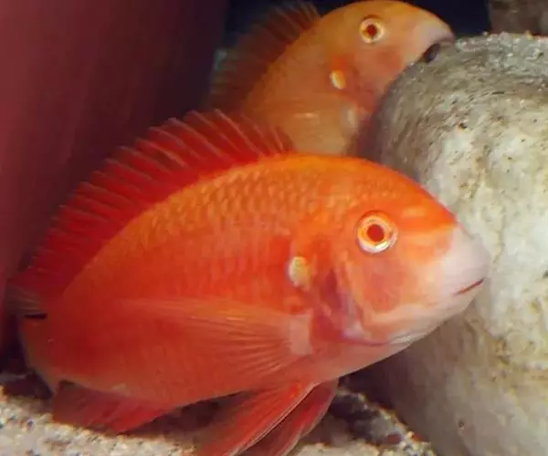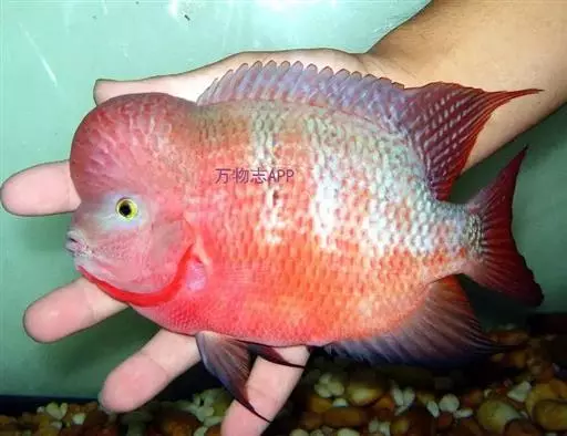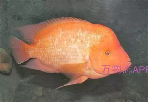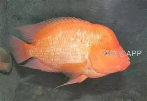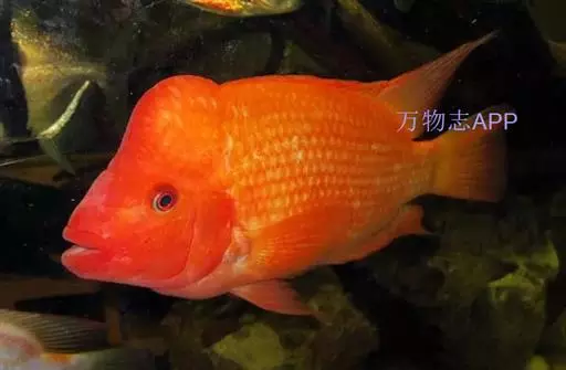 大型慈鲷,体格强健,厚侧扁形,约25厘米,大者可长达30厘米,全身橘红或鲜红,雄性额头半球状突起,高于颅顶,为全身制高点,雌鱼额头仅稍稍隆起。雄鱼背鳍和臀鳍的后缘鳍条延长。血鹦鹉鱼的父本,金刚鹦鹉鱼的母本。捕食性鱼类。