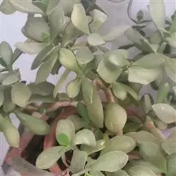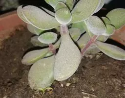 叶片长圆型,环状对生,叶片先端微尖,叶色在强光与昼夜 温差大或冬季低温期叶色会变的非常漂亮的蓝白,叶尖常年轻微红褐色,弱光则叶色浅蓝,叶片变的窄且长,枝条也容易徒长。