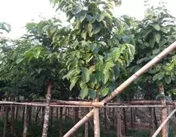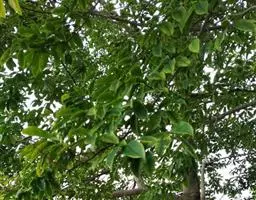4、川桂,常绿高大乔木。枝紫灰褐色,光滑。单叶互生或近对生;革质,卵形至长卵形,长8-15cm,宽3-5cm,先端渐尖而顶点钝,基部楔状或钝形,全缘,上面绿色,无毛,下面微被白粉,幼时有白色绢状毛,后渐脱落;具离基3出脉,在下面不隆起。花小,白色,成圆锥花序或伞形花序;总花梗细长,长1-6cm,光滑或微被毛,小花梗丝状,先端渐粗,具细毛;花被6裂,内外皆疏生绢状细毛;雄蕊与雌蕊均与前种相似。浆果基部具截形之宿存萼筒,全缘。花期5-6月。果期7-10月。