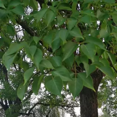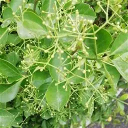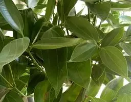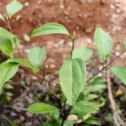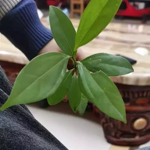 2、阴香。常绿乔木,高达20m。小枝赤褐色,无毛。叶近于对生或散生,革质,卵形或长椭圆形,长6-10cm,宽2-4cm,先端短渐尖,基部楔形至近圆形,全缘;上面绿色,有光泽,下面粉绿色,两面均无毛,具离基3出脉,脉腋内无隆起的腺体;叶柄长8-12mm。圆锥花序顶生或腋生;花小,绿白色,花被6,基部略合生,长4-5mm,两面均被柔毛;能育雄蕊9,排成3轮,外面2轮花药内向,第3轮花药外向,花药均为卵形,4室,瓣裂,花丝短,最内尚有1轮退化雄蕊;雌蕊1,子房上位,1室,1胚珠,花柱细,柱头小。浆果核果状,卵形,长不及1cm,直径约5mm,基部具肥厚杯状的宿存花被,其先端具6截形短裂片。花期3-4月。果期4-10月。