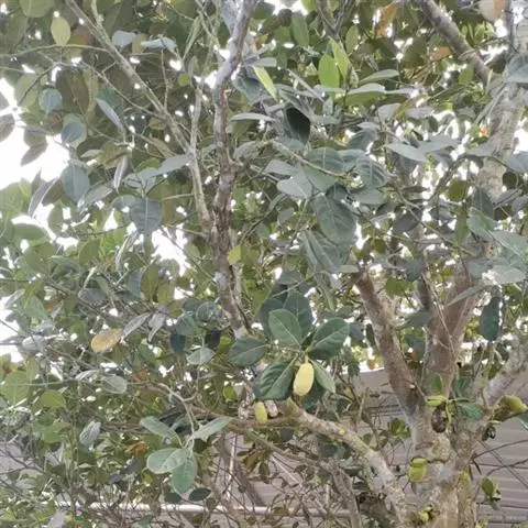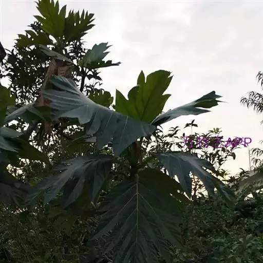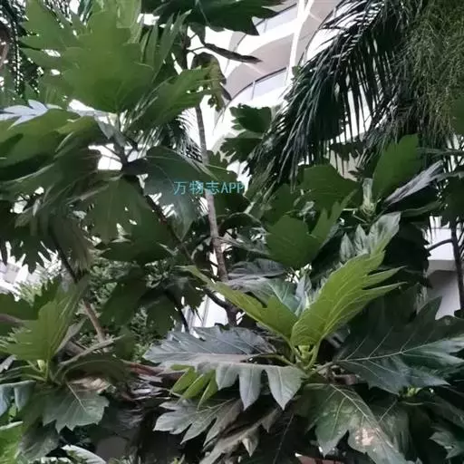 面包树(学名:Artocarpus incisa (Thunb.) L.)桑科常绿乔木,高10-15米;树皮灰褐色,粗厚。叶大,互生,厚革质,卵形至卵状椭圆形,两面无毛,表面深绿色,有光泽,背面浅绿色,全缘;叶柄长8-12厘米;托叶大,披针形或宽披针形,黄绿色,被灰色或褐色平贴柔毛。花序单生叶腋,雄花序长圆筒形至长椭圆形或棒状,黄色;雄花花被管状,被毛,上部2裂,裂片披针形,花药椭圆形,花柱长,聚花果倒卵圆形或近球形,绿色至黄色,表面具圆形瘤状凸起,成熟褐色至黑色,柔软,内面为乳白色肉质花被组成;核果椭圆形至圆锥形。栽培的很少核果或无核果。