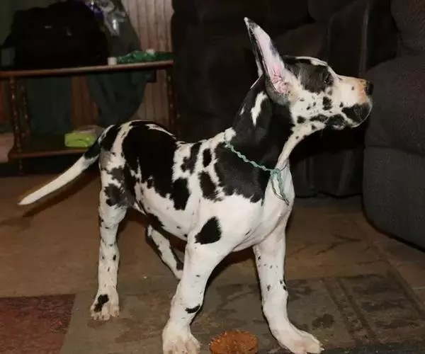 大丹犬也称做大丹狗、德国獒曾被欧洲王室及贵族饲养,是贵族身份地位的象征,体高一般为70~90公分,体重为50~70公斤。毛短厚而富有光泽,头大而窄长,毛呈黄褐、虎斑、蓝色,黑色或黑白花色等。