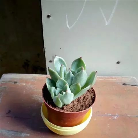蜡牡丹,Echeveria nuda,景天科,拟石莲花属。蜡牡丹,是属内较为特殊的一个种类。植株易生侧芽,常形成群生状。叶片肉质厚实,轮生,卵圆形或心形,叶端有钝尖,叶面不平,呈中间内凹,两边中心部位凸起,排列紧密成莲花状,几乎看不见茎,组成的叶盘,犹如一朵盛开的微型、精致的牡丹花。叶片常为绿色,但到了秋冬季节,随着温差加大,再加上光照充足,叶色会转变为红色,有的也会变成黄色,并有红色的叶缘,尤其是叶子表面呈蜡质状的油亮光泽,更具有迷人的特质。花期春季。