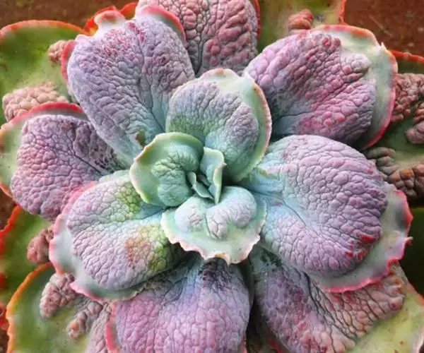狂野男爵是中大型园艺变种,植株看起来是真的恶心,且怎么养都会长高的品种。狂野男爵植株的茎部较粗壮,随着生长而逐渐伸长长高。叶片莲座型密集排列,株径可达20厘米以上。叶片长圆形,叶片有点波浪状,植株的叶面大面积凸起不规则疣凸,叶色为浅绿至紫红,新叶色浅、老叶色深。强光与昼夜温差大或冬季低温期叶色绿至紫红,叶尖和叶缘轻微发红,老叶和叶片的疣凸会紫红,弱光则叶色浅绿,叶片变的窄且长,也会非常薄。狂野男爵叶面上覆有微白粉,老叶白粉掉落後呈光滑状,生长中的狂野男爵老叶片容易轻微下翻。