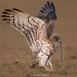 靴隼雕:是鸟纲、鹰科的中型鹰类。全长约40-53厘米,头、颈白色沾棕,纵贯以暗褐色轴纹,眉纹黑色。…