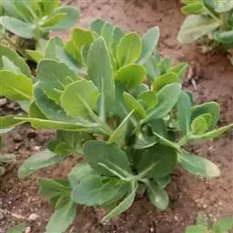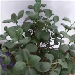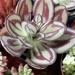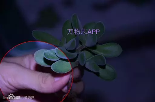 叶肉质肥厚,紫灰色,倒卵形,匙形或椭圆形,宽2.5-3.5厘米,长0.5-1.5厘米,叶尖尖锐,基部渐短粗,全缘,无毛,具白粉。