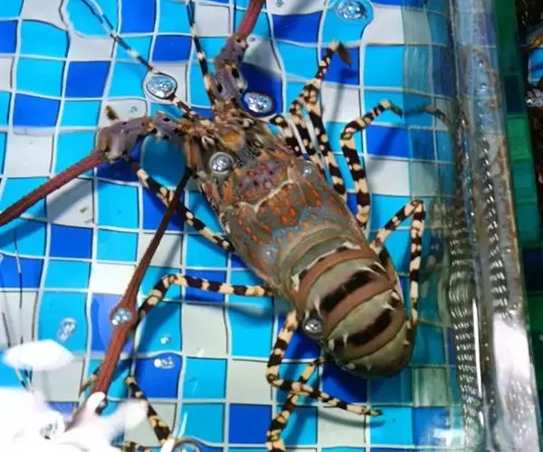 锦绣龙虾(Panulirus ornatus)为无螯下目,龙虾科,龙虾属的一种,俗称青龙虾、花龙虾、山虾、大和虾、沙虾等。体长可达60厘米,是龙虾属中体型最大者。腹部、第一触角和步足有黑褐色和黄色相间的斑纹。触角的基部有四对疣刺,后面的一对较小。体色多彩明亮。