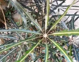 指状复叶3-6个轮生茎顶;托叶多数,簇生,线形,长不足2毫米;叶柄长5-11.5厘米,具条纹,光滑无毛;小叶柄中央的长1.2-3.5厘米,两侧的长0.2-1.2厘米,无毛;叶片膜质 ,中央的最大,长椭圆形至倒卵状长椭圆形,长7-13厘米,宽2-5厘米,先端渐尖至长渐尖,基部阔楔形至圆形,两侧叶片最小,椭圆形至圆状长卵形,长3.5-7厘米,宽1.3-3厘米,先端渐尖至长渐尖,基部偏斜,边缘具重细锯齿,齿尖具短尖头,齿间有1刚毛,两面沿脉疏被刚毛,主脉与侧脉在两面凸起,网脉不显。