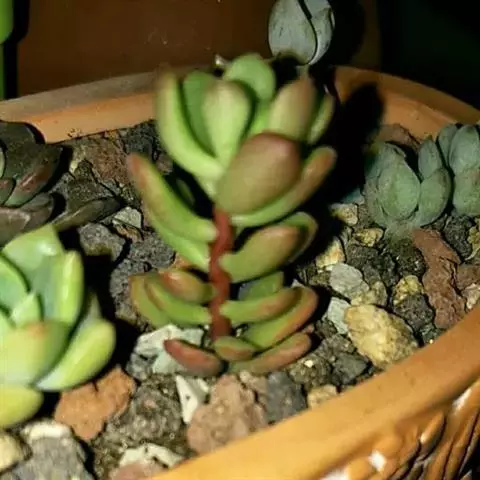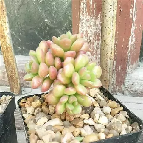 魔南景天属,卵形叶子,一种奇特的 植物。 种名anagensis以原产地之一、海拔600-100(〕米的Anaga山命名。作为魔南属体型最大的一种,能长至约巧厘米高。1.5-2厘米长的叶片形似小梭子,叶子中心有条小凹槽,叶和叶之间的间距较大,有明显的茎部,易群生,会长成一丛可爱的”小灌木”状。喜欢湿度稍微大一点的环境。和其他几种魔南不同,开花时雄蕊呈现很漂亮的红色。