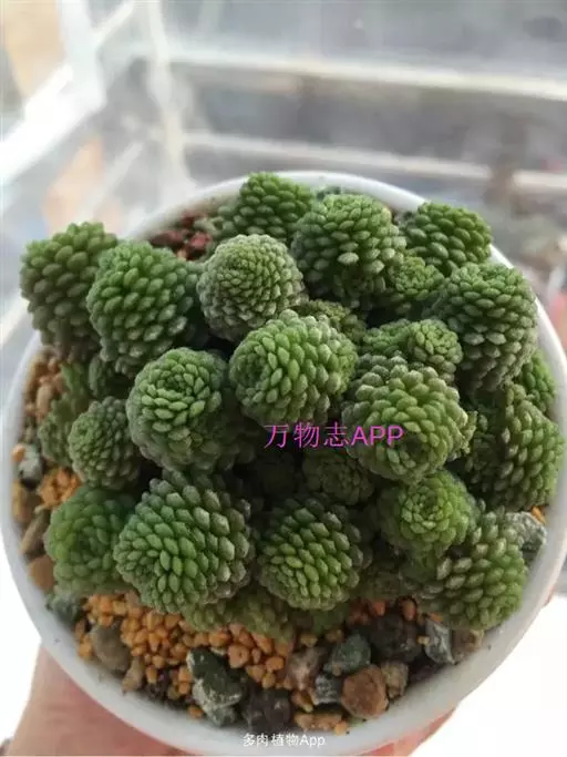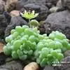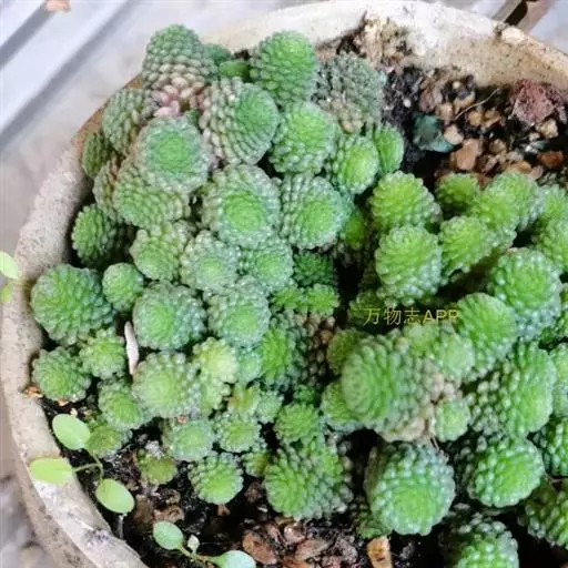 壁生魔南景天科魔南景天属多肉植物,壁生魔南植株叶面上布满半透明状的疣凸,就像裹了层白砂糖。小小的叶片莲花状组成约1厘米直径的叶冠。温差大的时候,叶片呈现迷人的紫色。初夏开花,单花品种,花朵较小,授粉不易。