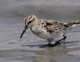 雌性成鸟:头顶黑色,羽端具白色或皮黄色斑点;两肩及背暗灰褐色,具细小的棕栗色波状纹及黑色横斑,有时还具棕白色条纹;腰及尾上覆羽几纯黑色,亦具细小的棕栗色波状纹;尾羽与背同色。翅上覆羽和最内侧次级飞羽与背同色,具淡棕白色和黑色相间的宽斑;飞羽暗褐色,最外侧2枚初级飞羽外翈羽缘棕白色。眼先、眼周及两颊棕白,有黑色近端带斑。颏、喉及上胸黑色;颈侧、胸侧及下胸皮黄色,具宽阔的黑色横斑;其余下体包括尾下覆羽白色而缀淡橙褐色,或为淡棕褐色。