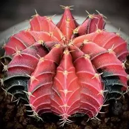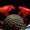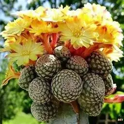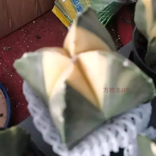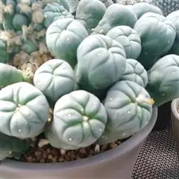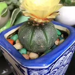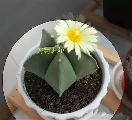 鸾凤玉 植株球形,老株变为细长筒状。球体直径10~20厘米,有3~9条明显的棱,多数为5棱。棱上的刺座无刺,但有褐色绵毛。球体灰白色密被白色星状毛或小鳞片。花朵着生在球体顶部的刺座上,漏斗形,黄色或有红心。三棱的“三角鸾凤玉”较稀有名贵,四棱的“四角鸾凤玉”也称四方玉,四条阔棱均匀对称,也很有趣。