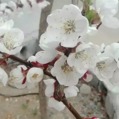 总状花序多花密集,长5-7厘米,基部无叶;花梗长4-6毫米(栽培标本有的可达1.5厘米),总花梗和花梗均被稀疏短柔毛;花直径8-10毫米;萼筒钟状,比萼片长近1倍,萼片三角状披针形或卵状披针形,先端长渐尖,边有不规则带腺细齿,萼筒和萼片内外两面均被疏柔毛;花瓣白色,长圆状倒卵形,先端1/3部分啮蚀状,基部楔形,有短爪,着生在萼筒边缘,为萼片长的2倍;雄蕊25-30,排成紧密不规则2-3轮,花丝长短不等,着生在萼筒上,长花丝比花瓣稍长;雌蕊1,心皮无毛,柱头盘状或半圆形,花柱基部有疏长柔毛,和雄蕊近等长。核果近球形,直径5-7毫米,紫褐色,无毛;果梗无毛;萼片脱落;核有皱纹。花期4-5月,果期6-10月。