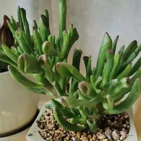 植株呈多分枝的灌木状,茎明显,圆形,表皮黄褐色或灰褐色。 叶互生,在茎或分枝顶端密集成簇生长,肉质叶筒状,长4厘米至5厘米,粗0.6厘米至0.8厘米,顶端呈斜的截形,截面通常为椭圆形,叶色鲜绿,顶端有些许微黄,有蜡状光泽,冬季其截面的边缘呈红色,叶形奇特,色彩宜人,是理想的室内小型观叶植物。