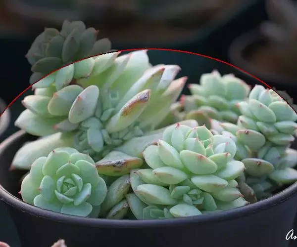 叶片呈三角形至卵形,叶尖锐利。基部叶片长约4~7厘米,宽约3厘米左右,厚约0.5厘米。叶缘圆滑且呈半透明。叶尖或叶缘有时变红。