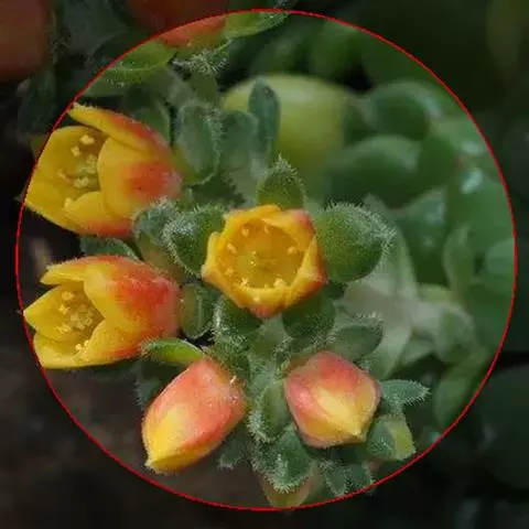 萼片开张,长度小于0.5厘米。花冠锥状至瓮状;基部粉红色,长1.0-1.4厘米,直径0.5-0.8厘米;前端黄色,直径0.5-1.0厘米 东云的花(摄影:BenoîtHenri) 。