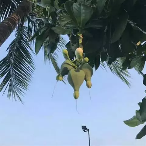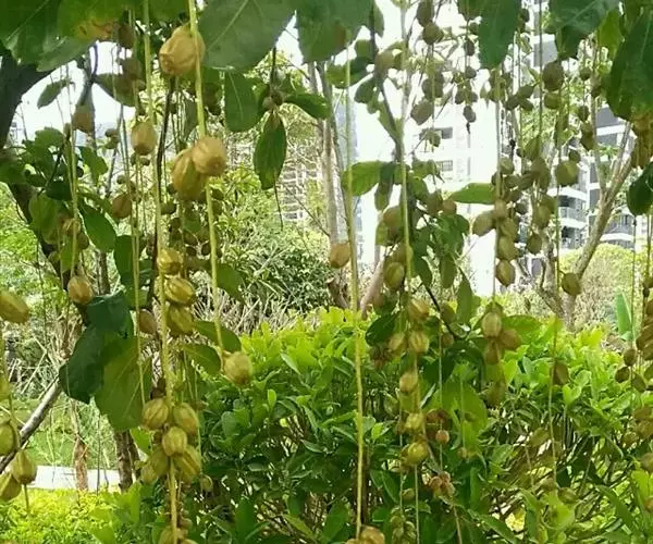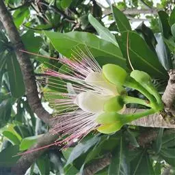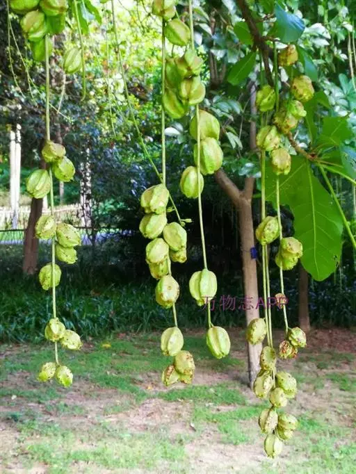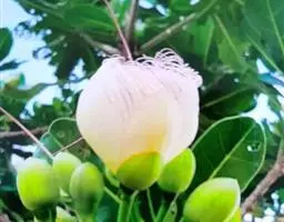 总状花序顶生,稀在老枝上侧生,下垂,长达70厘米或更长,总梗直径2-5毫米;花疏生,花梗长0.5-1.5厘米或稍过之;苞片小而早落;萼撕裂为2-4片,裂片等大或不等大,椭圆形至近圆形,长0.7-1.3厘米;花瓣4,椭圆形至卵状披针形,长1.5-2.5厘米;雄蕊通常6轮,最内轮为不育雄蕊,发育雄蕊花丝长3-4.5厘米左右;子房常3-4室,隔膜完全,胚珠每室2-3颗。果实卵圆形,长5-7厘米,直径2-4.5厘米,微具4钝棱,果皮厚3-12毫米,稍肉质,内含网状交织纤维束;种子卵形,长2-4厘米。花期几乎全年。