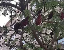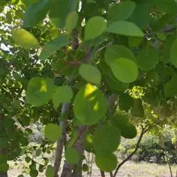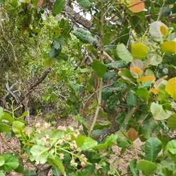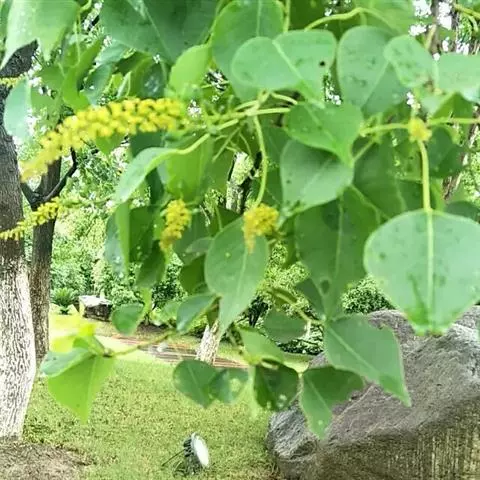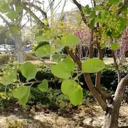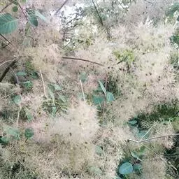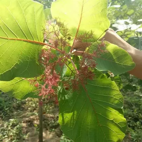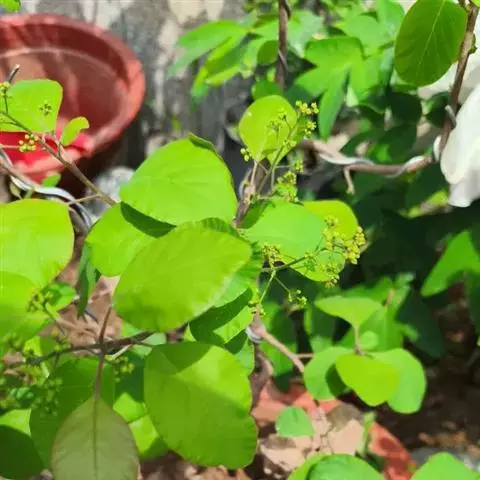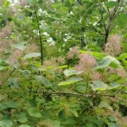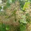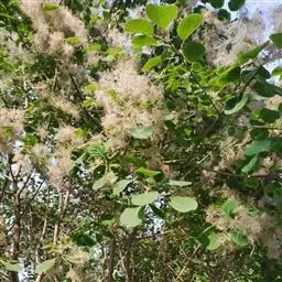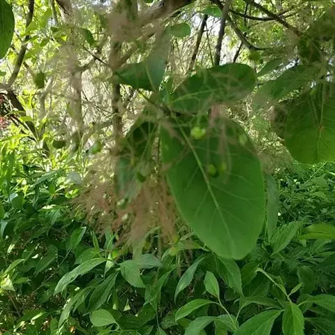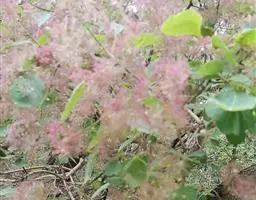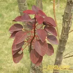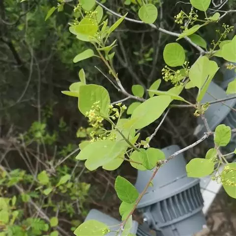 粉背黄栌 灌木,高2—7米;小枝圆柱形,棕褐色,无毛。叶互生,纸质,卵圆形,长3.5—10厘米,宽2.5—7.5厘米,先端微凹或近圆形,基部圆形或浅心形,全缘,两面无毛,叶背明显被白粉;叶柄长1.5—3.3厘米,上面平。圆锥花序顶生,无毛,长达23厘米;花杂性,黄绿色;苞片技针形,长约1.5毫米;花柄长约3毫米,纤细;花萼5裂,裂片狭三角状披针形,长约1.1毫米,宽约0.5毫米,无毛,先端短尖;花瓣5,卵形或卵状椭圆形,长约1.6毫米,宽约0.9毫米,无毛;雄蕊5,长约1.2毫米,花丝近钻形,花药卵圆形,与花丝等长;花盘大,黄色,盘状;子房近球形,偏斜,径约0.4毫米,无毛,花柱3,分离,近顶生。核果棕褐色,无毛,具皱纹,近肾形,长4-4.5毫米,宽2.5—3毫米。