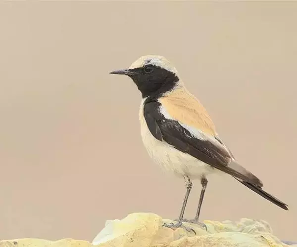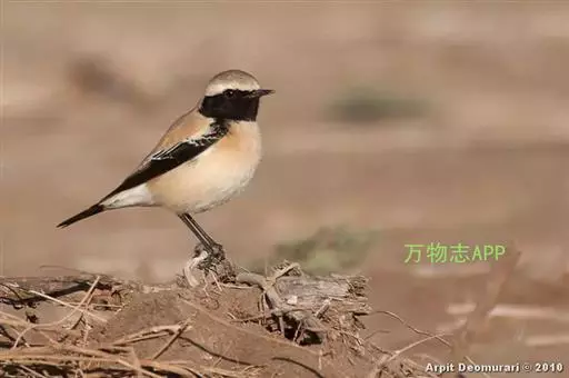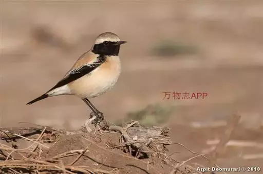 雄鸟前额、头顶、枕、后颈、肩、背沙皮黄色或土棕色,头顶有一点白和微沾灰色,下背和肩更多皮黄色或棕色,腰和尾上覆羽白色或乳黄白色。尾黑色,基部白色。翅黑色,飞羽基部白色,内侧翅上覆羽白色,形成显著的翅上白斑,其余翅上覆羽和飞羽具皮黄白色羽缘。前额基部白色或皮黄白色,有一宽阔的白色眉纹亦为白色,眼先、脸颊、头侧、颈侧、颏、喉和上胸黑色,其余下体白色或淡皮黄色,下胸较亮,多呈淡棕色。腋羽和翅下覆羽黑色,尖端白色。秋季换上的冬羽黑色部分具白色羽缘,眉纹不明显,背部亦较夏羽暗,其他和夏羽相似。