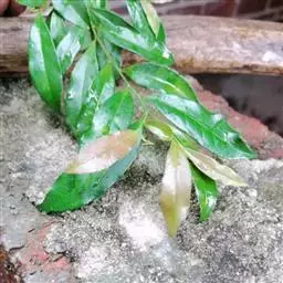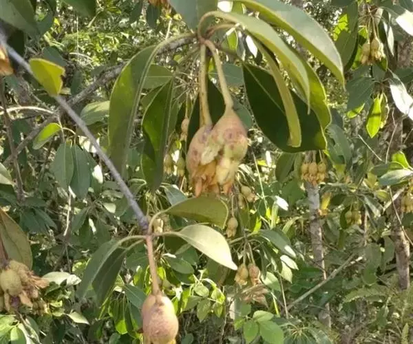 乔木,高约15米,有时为灌木状或小乔木;树皮黑褐色;小枝灰白色或灰褐色,圆柱形,无毛。叶革质,通常聚生在嫩枝近顶端,呈假轮生状,叶形变异很大,通常为椭圆形或长圆状椭圆形至狭椭圆形,有时近披针状椭圆形,偶有为阔椭圆形至卵状椭圆形,长8-13 厘米,宽3-5.5 厘米,偶有为6-7厘米,宽2-2.5厘米,顶端短渐尖,有时短尖,尖顶钝,偶有近钝形或圆钝形,基部楔形或阔楔形,边全缘或具稀疏浅钝齿,稍反卷,上面深色,有光泽,下面淡绿白色,密被红褐色腺点;中脉在上面稍凹下,下面隆起,侧脉10-12对,上面稍明显,下面不甚明显,有时稍隆起;叶柄长2-3厘米。