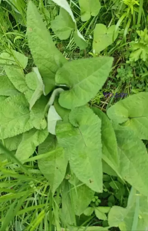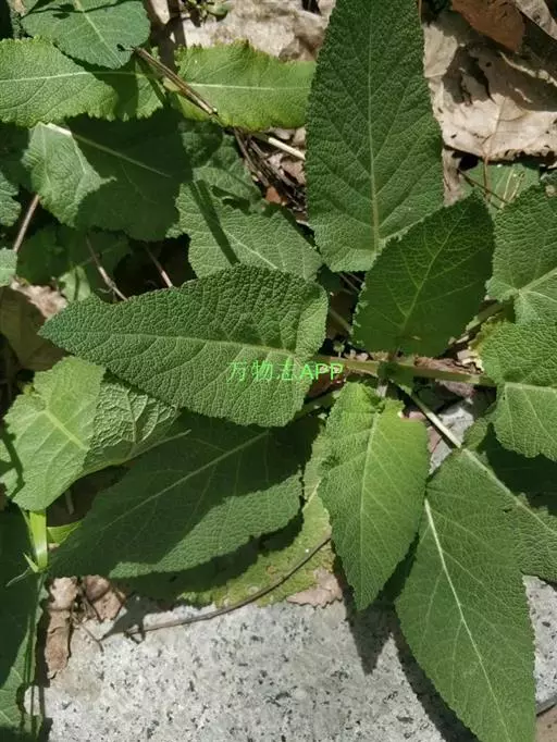 叶有基出叶和茎生叶两种,均具柄,叶片三角状或椭圆状戟形,稀心状卵圆形,有时具圆的侧裂片,长5-11厘米,宽3-7厘米,先端锐尖,基部心形或戟形,边缘具近于整齐的圆齿状牙齿,草质,上面绿色,被微硬毛,下面灰白色,密被灰白绒毛;根出叶的叶柄长6-21厘米,茎生叶的叶柄长1-4厘米,密被微柔毛。