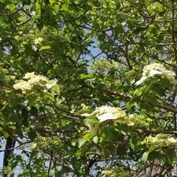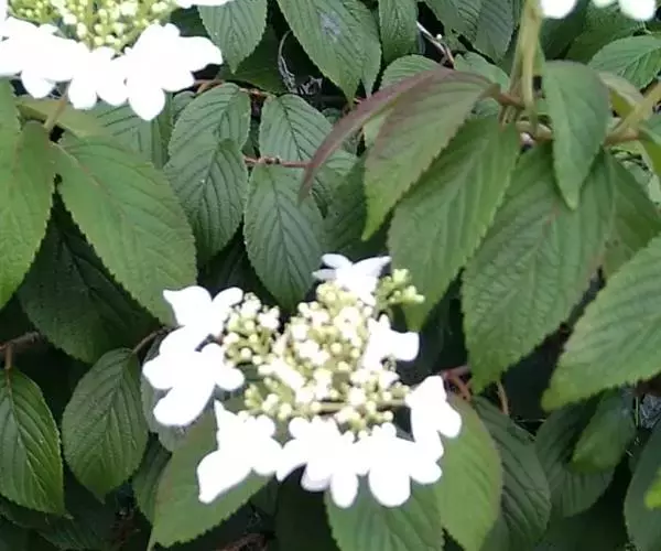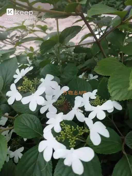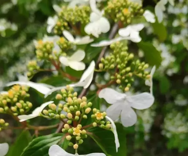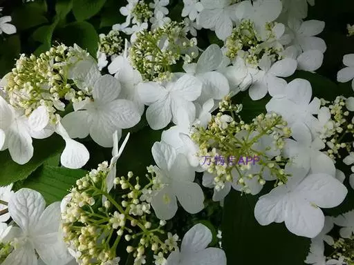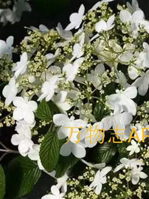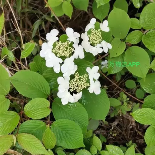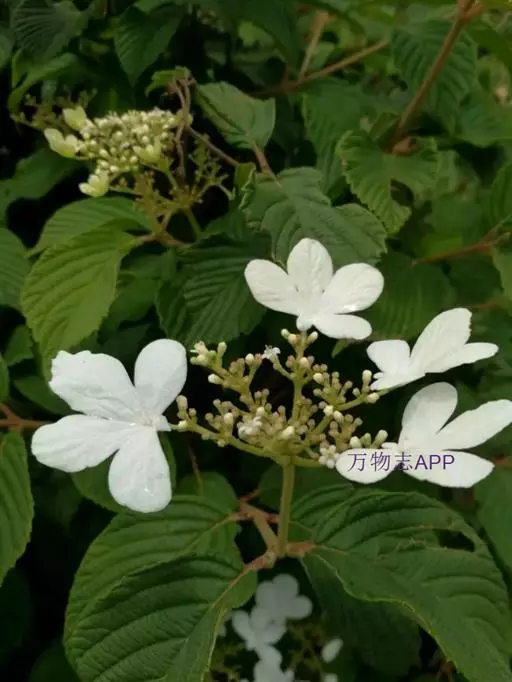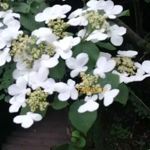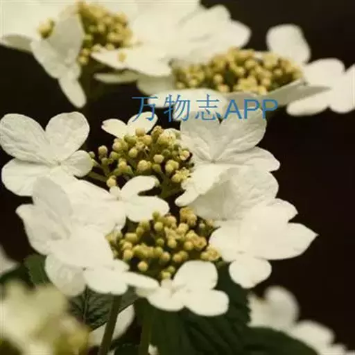 花序直径4-10厘米,外围有4-6朵白色、木型的不孕花,具长花梗,花冠直径达4厘米,不整齐4-5裂;中央可孕花直径约3毫米,萼筒长约15毫米,花冠辐状,黄白色,裂片宽卵形,长约等于筒,雄蕊高出花冠,花药近圆形。果实先红色后变黑色,宽卵圆形或倒卵圆形,长5-6毫米,直径约4毫米;核扁,两端钝形,有1条上宽下窄的腹沟,背面中下部还有1条短的隆起之脊。花期4-5月,果熟期8-9月。