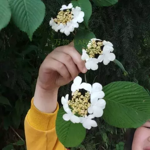 蝴蝶戏珠花花大如盘六寸围,沃土丛生胜浇肥;金黄银白花去后,鲜果累累色彩绯;蝴蝶戏珠花花大如盘,真花如珠,装饰花似粉蝶,远远望去,好似群蝶戏珠,惟妙惟肖,栩栩如生,故而获得“蝴蝶戏珠花”的美名。