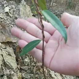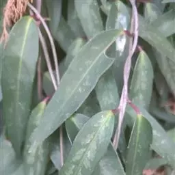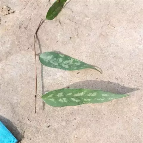叶纸质,倒披针形、狭椭圆形,长4-11厘米,宽1.5-3.5厘米,先端渐尖,2/3以下渐狭成楔形;边缘具胼胝质齿尖的浅齿或仅具齿尖,近全缘,上面深绿色,下面灰绿带苍白色;侧脉每边5-7条;叶柄长1-2.5厘米,红色,具叶下延的狭膜翅。