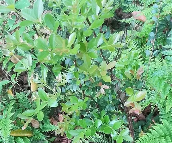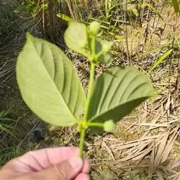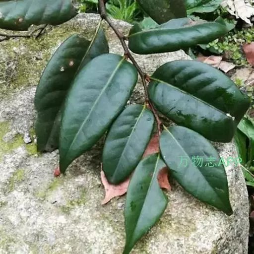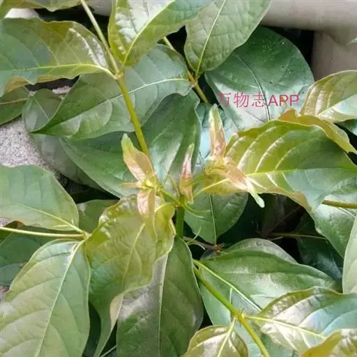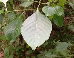 叶纸质,椭圆形或椭圆状长圆形,长5-12cm,宽3-7cm,两面均无毛,干时褐色或红褐色,下面有时有白粉,顶端短尖或骤尖,基部楔形至截形,有时稍下延;侧脉4-8对,脉腋窝陷有粘液毛;叶柄长5-15mm,无毛;托叶狭三角形,深2裂达全长2/3,外面无毛,里面无毛或基部具粘液毛,裂片线形至三角状披针形。