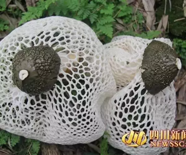竹荪(Dictyophora indusiata (Vent.ex Pers) Fisch)又名竹笙、竹参,常见并可供食用的有4种:长裙竹荪、短裙竹荪、棘托竹荪和红托竹荪,是寄生在枯竹根部的一种隐花菌类,形状略似网状干白蛇皮,它有深绿色的菌帽,雪白色的圆柱状的菌柄,粉红色的蛋形菌托,在菌柄顶端有一围细致洁白的网状裙从菌盖向下铺开,被人们称为“雪裙仙子”、“山珍之花”、“真菌之花”、“菌中皇后”。