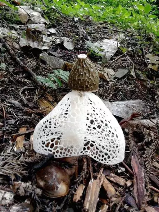 竹荪幼担子果菌蕾呈圆球形,具三层包被,外包被薄,光滑,灰白色或淡褐红色;中层胶质;内包被坚韧肉质。成熟时包被裂开,菌柄将菌盖顶出,柄中空,高15cm~20cm,白色,外表由海绵状小孔组成;包被遗留于柄下部形成菌托;菌盖生于柄顶端呈钟形,盖表凹凸不平呈网格,凹部分密布担孢子;盖下有白色网状菌幕,下垂如裙,长达8厘米以上;孢子光滑,透明,椭圆形,3~3.5×1.5~2微米。