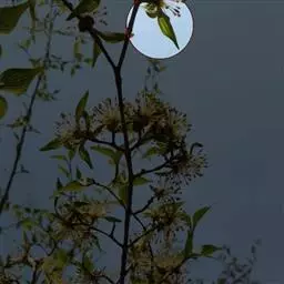 花1朵,稀2朵;花梗长1-2.2厘米,无毛或微被短柔毛;花直径2-2.5厘米;萼筒钟状,萼片长卵形,先端圆钝,边有疏浅锯齿,与萼片近等长,萼筒和萼片外面无毛,萼筒内面有疏生短柔毛;花瓣白色,长圆形或匙形,边缘波状,基部楔形,着生在萼筒边缘;雄蕊25-30,花丝长短不等,紧密地排成不规则2轮,比花瓣稍短;雌蕊1,心皮被长柔毛,柱头盘状,花柱比雄蕊稍长,基部被稀长柔毛。核果近球形或椭圆形,长宽几相等,直径2-3厘米,黄色、红色或黑色,微被蜡粉,具有浅侧沟,粘核;核椭圆形或卵球形,先端急尖,浅褐带白色,表面平滑或粗糙或有时呈蜂窝状,背缝具沟,腹缝有时扩大具2侧沟。花期4月,果期8月。2n=16,17,24。