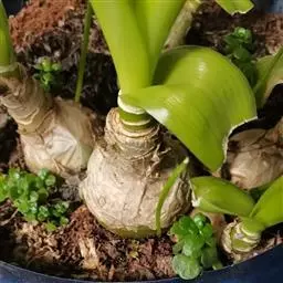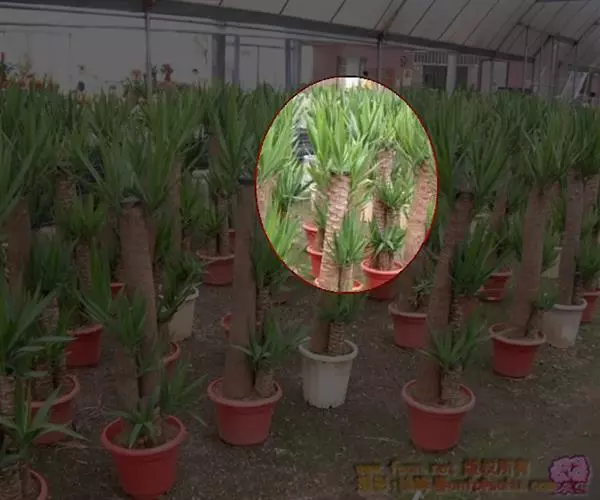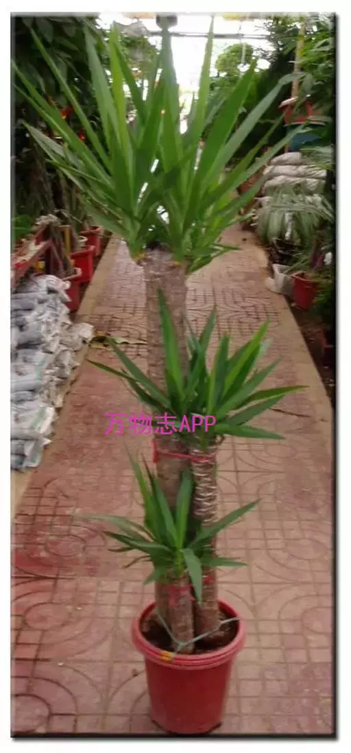 象脚丝兰又叫象脚玉兰,与凤尾兰同属于龙舌兰科的丝兰属,两者的形态特征也较为相似。象脚丝兰为常绿木本植物,在原产地株高可达10米,盆栽的株高多为l一2米。茎干粗壮、直立,褐色,有明显的叶痕,茎基部可膨大为近球状。叶窄披针形,着生于茎顶,末端急尖,长可达100厘米、宽约8—10厘米;叶革质,坚韧,全缘,绿色,无柄。