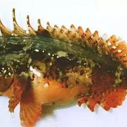 体延长,稍侧扁,前部粗大,向后渐细,一般体长14~24厘米、体重150~300克。头大,近方形。吻端中央凹入,两侧圆钝,各具几个小棘,边缘有锯齿,上下颌及犁骨具绒毛状牙群、头部背面及两侧均被骨板、体被大栉鳞、头和背部深红色,腹侧为乳白色。背鳍2个,其基部两侧各有一纵列有棘楯板。第1背鳍后上方有一红斑;胸鳍宽大位低、内侧呈红色;其下方有3条指状游离鳍条;尾鳍浅凹形,上叶略长于下叶;背、臀鳍呈浅红色。