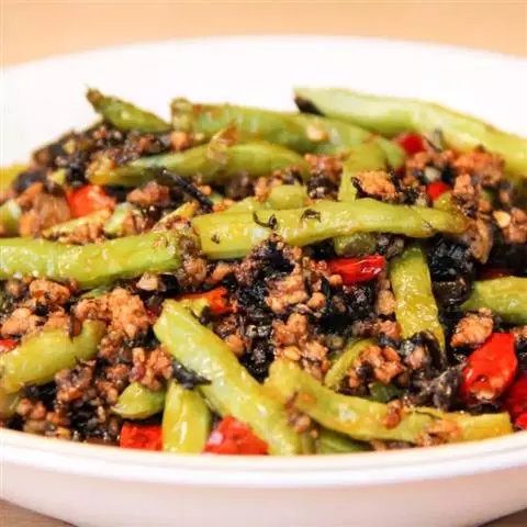 榄菜四季豆是以牛肉馅、四季豆为主料,盐、洋葱为配料制作而成的菜品。