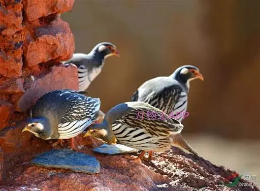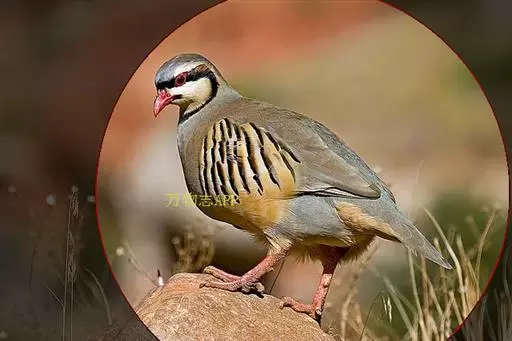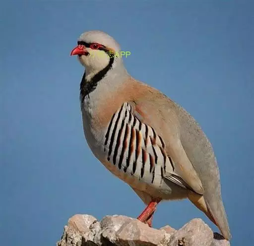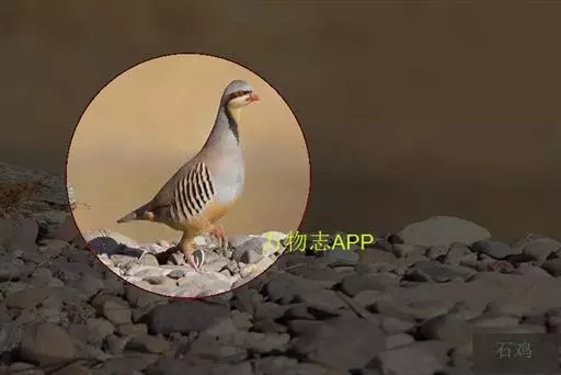 石鸡(学名:Alectoris chukar):是中型雉类,共有14个亚种,体长27-37厘米,体重440-580克,比山鹑稍大一些。两胁具显著的黑色和栗色斑。第1枚初级飞羽介于第5和第6枚飞羽之间,或于第6枚初级飞羽等长;第3枚初级飞羽常是最长的。尾圆;尾长约为翅长的2/3;尾羽14枚。雄者具微小的瘤状距,嘴和足红色。雌雄在羽色上一样,仅在大小上有些不同。嘴、脚珊瑚红色。虹膜栗褐色。眼的上方有一条宽宽的白纹。围绕头侧和黄棕色的喉部有完整的黑色环带。上体紫棕褐色,胸部灰色,腹部棕黄色,两胁各具十余条黑、栗色并列的横斑。