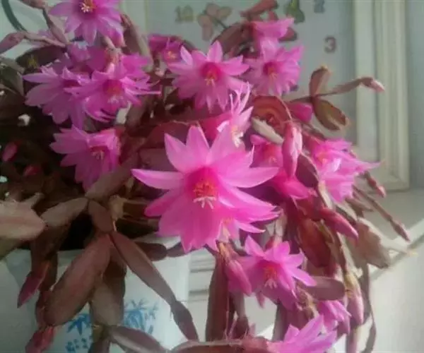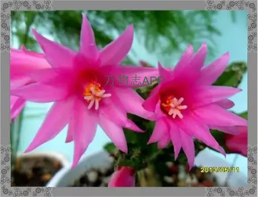 花期12月-来年2月。花瓣偏纤细,柔弱,多层,规则而又整齐,开花时花瓣向后翻折过去。雌蕊红色,雄蕊白色,均较长,伸出花筒外,与蟹爪兰相类似。花色多为纯红、桃红、嫩黄、和纯白。节茎边缘尖齿,周身绿色。幼叶紫红,成年后为绿色。(双层花,仙人指花一般下垂)