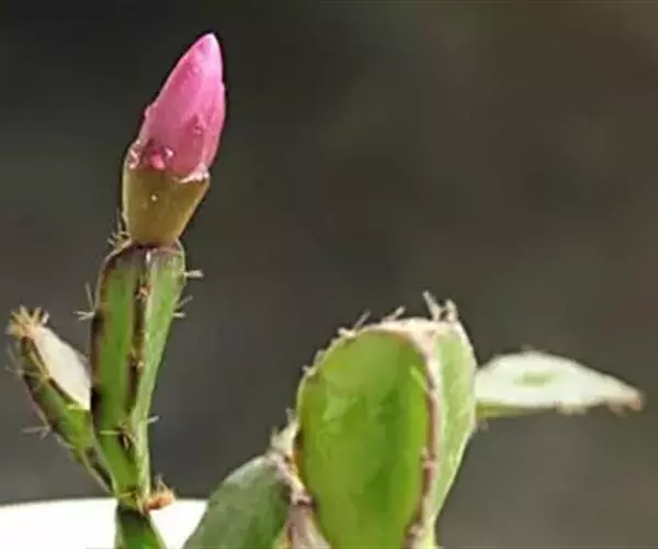 为附生植物,株高25厘米至30厘米,植株多分枝,呈丛状生长,茎节肥厚多肉,半直立,长2厘米至4厘米,形态富于就化,或具3棱至5棱;或仅2棱,呈扁平状;或呈不规则棱角状,一般规律是下部茎节棱多,接近状,上部茎节扁平,类似蟹爪兰。茎节的棱缘上具刺座,刺座上长有短绵毛和少数早落的刚毛。花顶生,粉红色至玫瑰红色,花茎3厘米至4厘米,呈辐射对称状,具清香。