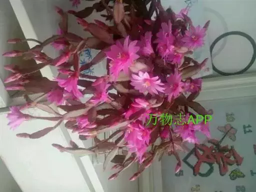 5--6月开花。(最晚)植株多分枝,呈丛状生长,肥厚多肉通常3-5棱,也有扁平状或不规则棱角状,棱缘紫红色。它的花要小点儿,而且花托四棱。花筒较短,花瓣也为单层,花瓣排列规则而又整齐。花为粉红色,与假昙花的花极为相似,不易区分,从茎节上辨别比较准确。 蟹爪兰、令箭荷花的花色变化最多,有红、黄、白及多种复色:仙人指一般只见有粉红色或玫瑰红色偶见淡黄色;假昙花的花一般是鲜红色:落花之舞花色也比较多,且有清香味。