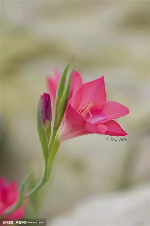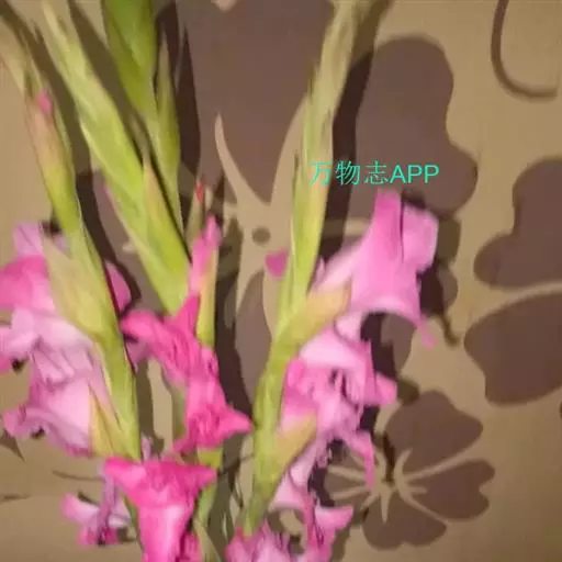 多年生草本。球茎扁圆球形,直径2.5-4.5cm,外包有棕色或黄棕色的膜质包被 唐菖蒲 。叶基生或在花茎基部互生,剑形,长40-60cm,宽2-4cm,基部鞘状,顶端渐尖,嵌迭状排成2列,灰绿色,有数条纵脉及1条明显而突出的中脉。